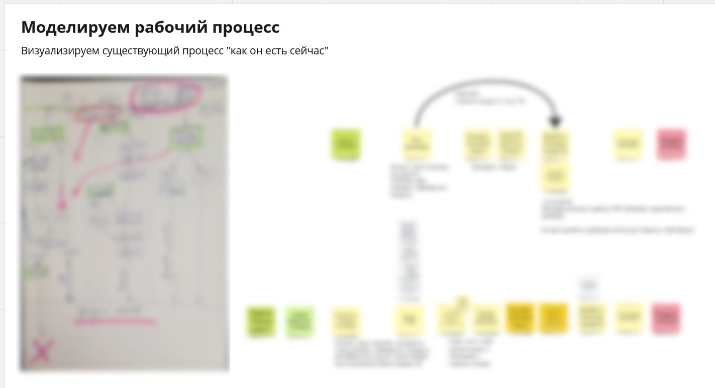 Далее участники описали существующий процесс: через какие этапы проходит проект по разработке нового продукта "от начала и до конца"? Очень важно на данном этапе не пытаться придумать какой-то новый "идеальный" процесс, а изображать то, "как оно есть сейчас" на самом деле.