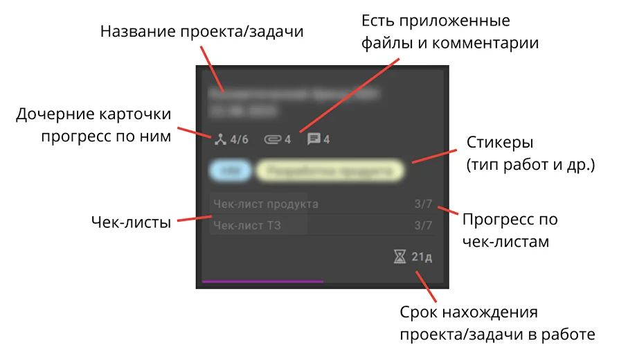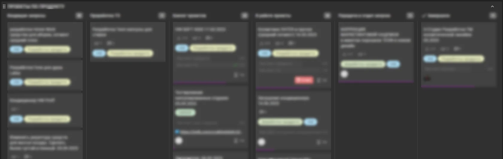Каждая карточка на доске — проект по разработке нового продукта. Внутри карточки: