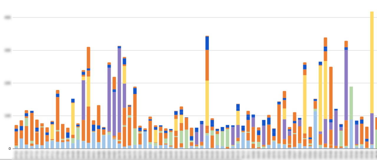 Количество блокировок в рабочем процессе за разные периоды. Цветом обозначены разные причины задержек.