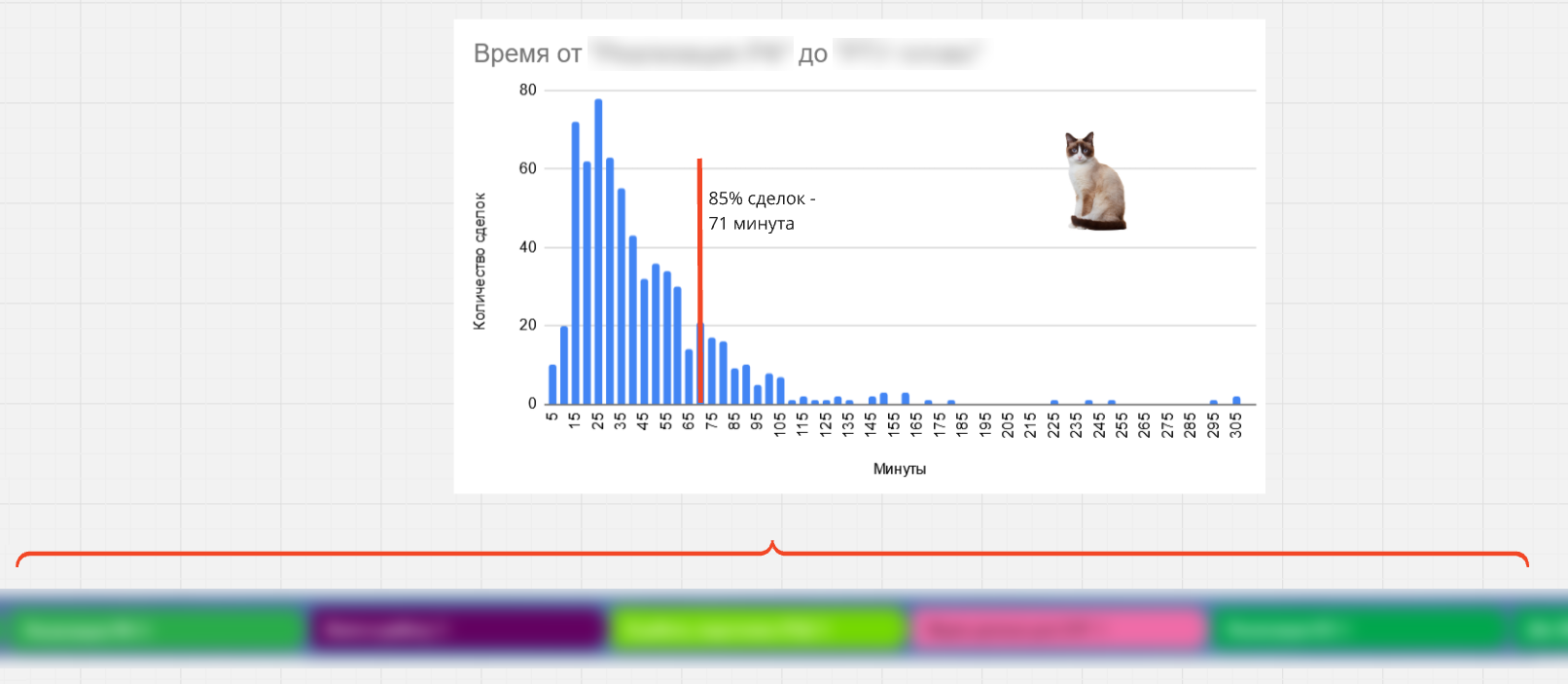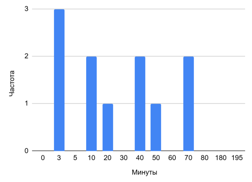 Далее в гугл-таблицах подготовили шаблоны и обучили руководителей построению ключевых метрик потока, таких как диаграмма распределения времени выполнения: