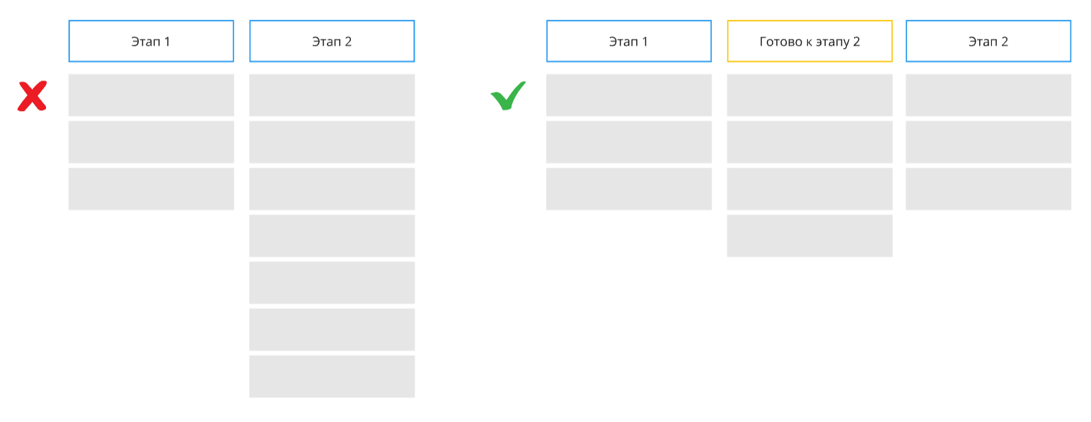 На такой доске сразу статус карточек понятен сразу: те что находятся на "готово к этапу 2" — к ним еще не приступали. А те что на "Этап 2" — над ними ведется работа.