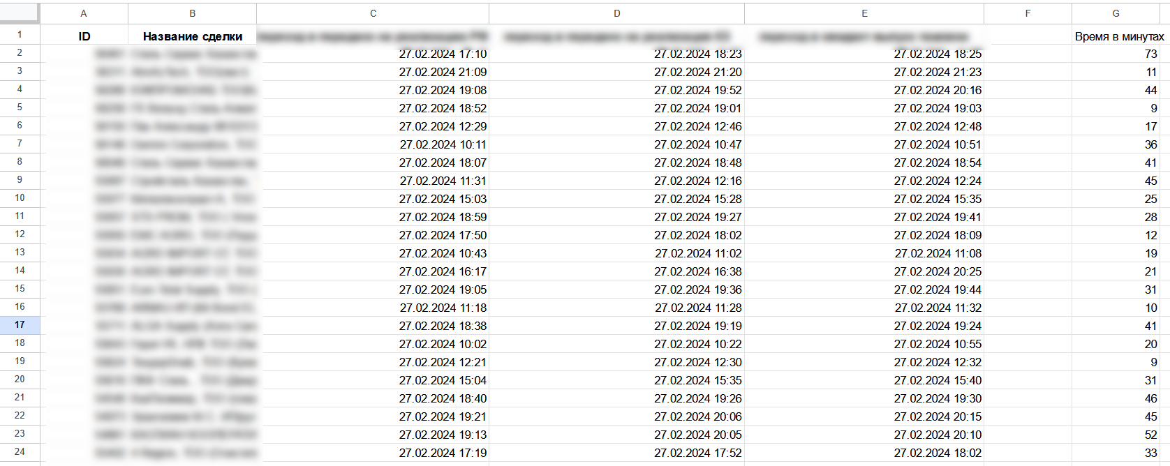 Цифровая Канбан-система, используемая компанией позволяет выгрузить дату и время перехода карточки между этапами рабочего процесса. Настроили выгрузку данных и загрузку в гугл-таблицы: