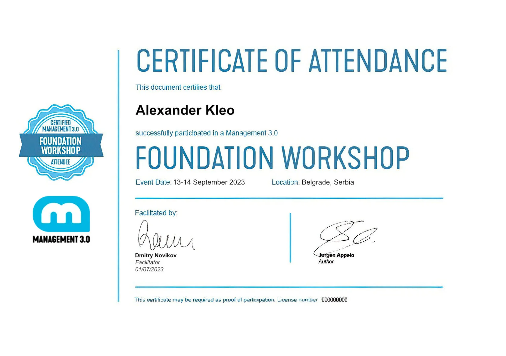 Участники, завершившие курс и сделавшие практику в своей команде, получают официальный сертификат по Менеджменту 3.0, который признается во всем мире